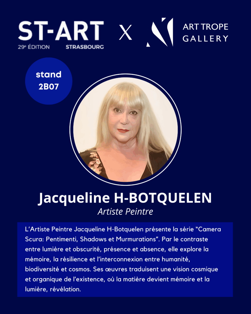 L’Artiste Peintre Jacqueline H-Botquelen présente la série “Camera Scura : Pentimenti, Shadows et Murmurations”. Par le contraste entre lumière et obscurité, présence et absence, elle explore la mémoire, la résilience et l’interconnexion entre humanité, biodiversité et cosmos.