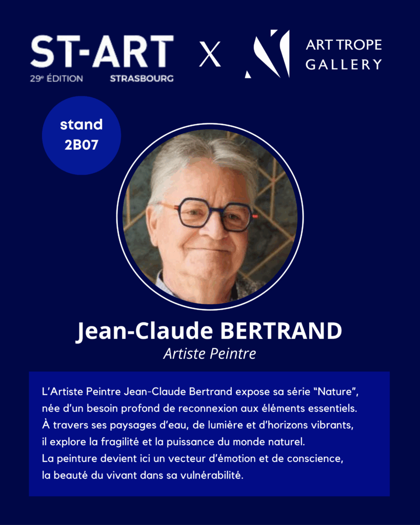 Pour cette édition, Art Trope Gallery, sous la direction curatoriale de Virginie Tison, présente au stand 2B07 un projet centré sur la mémoire, la perception et la résonance du monde naturel et humain. Le stand réunit trois artistes dont les approches complémentaires offrent une réflexion poétique et sensorielle sur notre rapport au vivant, à la ville et à l’univers : Jean-Claude Bertrand, Rodolfo Franchi et Jacqueline H-Botquelen.