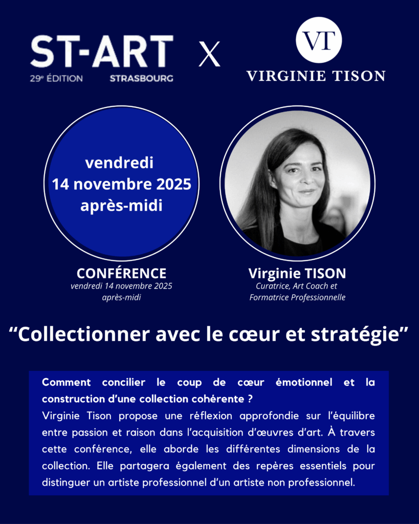 Virginie Tison vous invite à explorer la thématique « Collectionner avec le cœur et stratégie », une rencontre pour comprendre comment concilier l’émotion du coup de cœur avec la construction d’une collection d’art cohérente et pérenne. À travers des conseils concrets, cette conférence offre une vision éclairée pour collectionner avec passion et discernement.