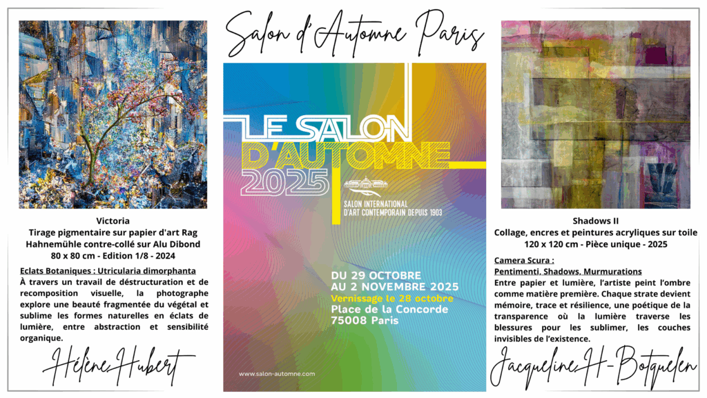 Nous avons le plaisir d’annoncer la participation de Hélène Hubert dans la Section Photographie et de Jacqueline H-Botquelen dans le Département Synthèse au Salon d’Automne 2025 du 29 octobre au 2 novembre 2025 au Pavillon éphémère – Place de la Concorde à Paris dont l’entrée s’effectue rue de Rivoli, face à l’Hôtel de la Marine.
