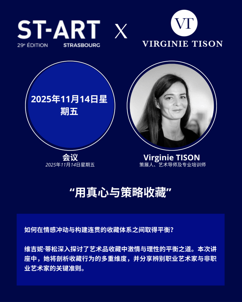 维吉妮·蒂松邀请您探索“用心与策略并重的收藏之道”主题,通过本次交流会,您将了解如何在情感冲动与构建连贯持久的艺术收藏之间取得平衡。本次讲座将提供切实可行的建议,为您以热情与慧眼进行收藏提供明智的指导。